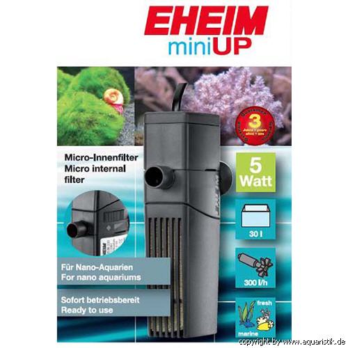 Die Pumpenleistung des Aquarienwassers ist beim Eheim MiniUP Micro-Innenfilter individuell auf bis zu 300 l/h regulierbar, wobei der Stromverbrauch 5 W beträgt. Der Eheim MiniUP Innenfilter ist für Süß- und Meerwasser geeignet.