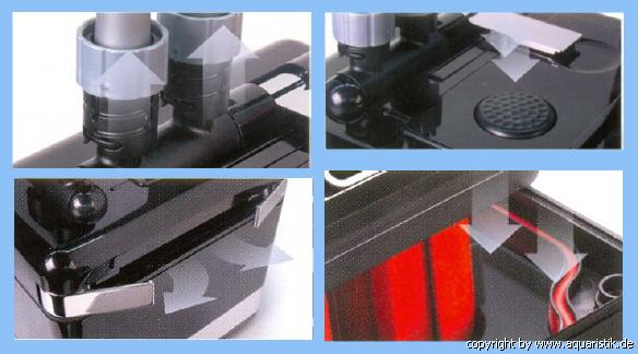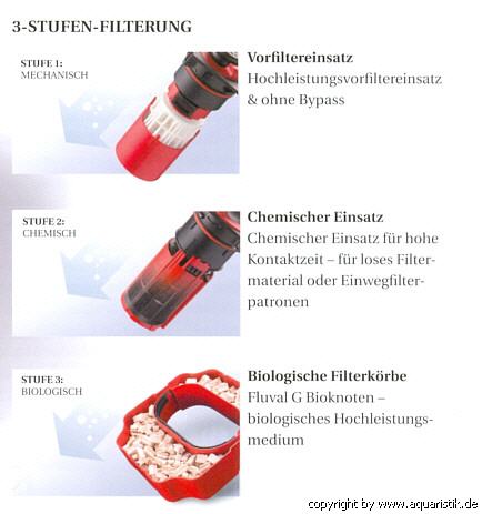 Das Filtereinsatzsystem ist für eine schnelle Entnahme der Filtereinsätze konzipiert worden und spart somit viel Zeit und Mühe. Bei der Entnahme der Filtereinsätze bleiben der Vorfilter- und der chemische Einsatz beim FLUVAL G Filter gut zugänglich und der wichtige biologische Medieneinsatz sitzt darunter. Somit wird eine komfortable Entnahme der Filtereinsätze, ohne den Behälter ganz zu öffnen, ermöglicht.