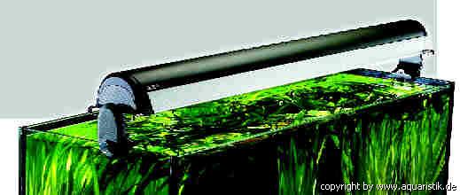 Integrierte Befestigungseinheit für hängende Installation über dem Aquarium; bei Nichtgebrauch einklappbar