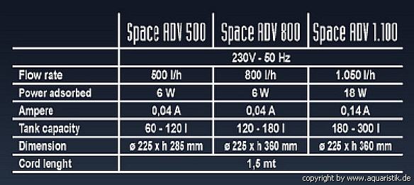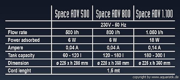 Die Filter der Serie Space ADV zeichnen sich durch ihre extrem leise Funktionsweise aus und verfügen über ein hohes Filtervolumen für Aquarien zwischen 60 und 300 Liter.