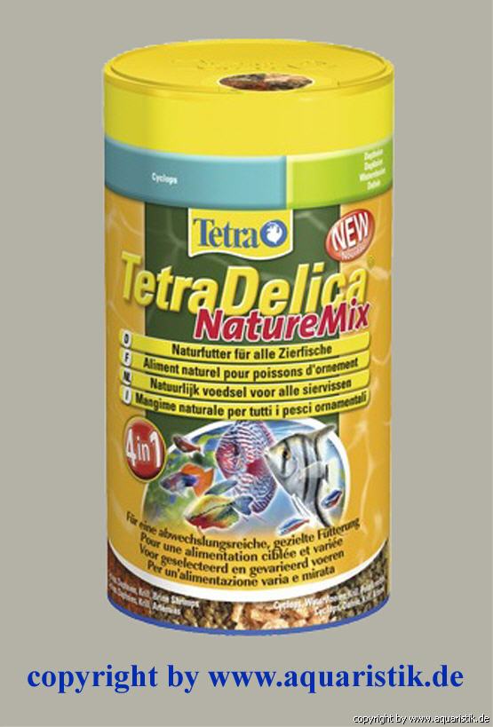 Mit dem neuen TetraDelica Nature Mix erweitert Tetra sein Angebot an Naturfuttern. Damit trägt der Marktführer in der Aquaristik dem Trend Rechnung, dass vor allem versierte Aquarianer ihren Fischen eine abwechslungsreiche und naturnahe Fütterung bieten möchten. Das neue Produkt beinhaltet vier Arten von Naturfutter: ballaststoffreiche Daphnien und proteinreiche Brine Shrimps sowie Cyclops und Krill. Diese beiden enthalten sowohl einen hohen Anteil an Carotinoiden für eine schöne Farbgebung als auch essentielle Omega-3-Fettsäuren für mehr Energie. Die Futtertiere sind sorgfältig gefrier- bzw. sonnengetrocknet, so dass die optimale Qualität und der ideale Nährwert garantiert werden können. Vitamine und Nährstoffe bleiben damit gut erhalten. Der TetraDelica Nature Mix bietet sich als Ergänzungsfutter für alle Zierfische an und ermöglicht dank der patentierten Dose mit vier einzelnen Kammern gezielt eine abwechslungsreiche und leckere Ernährung.