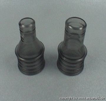 2 Düsenstücke, die als Ausströmdüsen dienen oder als Schlauchanschlussmöglichkeiten für die Schlauch-Ø 12/16 mm bzw. 16/22 mm eingesetzt werden. So können weitere Zusatzgeräte, wie z.B. UV-Klärer, CO2 Reaktoren usw. problemlos angeschlossen werden.