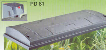 PD-AbdeckungFormschöne Abdeckung mit Leuchte und Futterschacht, passend für EHEIM Futter-oder Düngeautomat. PD 60/81 sind mit angestanzter Aussparung für EHEIM Hang-On Filter ausgestattet80x35cm 2 x 18 Watt
