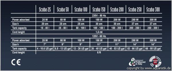 Scuba, eine Reihe von sieben Heizern von SICCE für Aquarien mit einer Leistung zwischen 25 und 300 Watt.