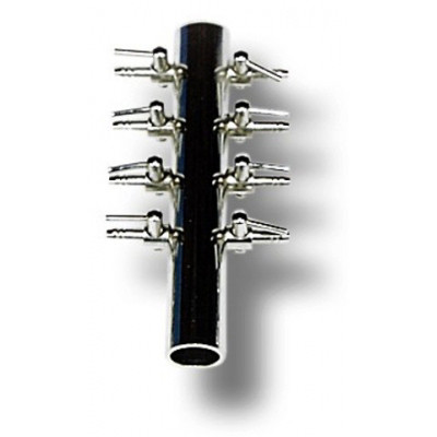 Verchromter Metall-Luftverteiler mit 8 Anschüssen, jeweils regelbar mit Absperrhahn. Tüllenende für 9 mm Schlauch.